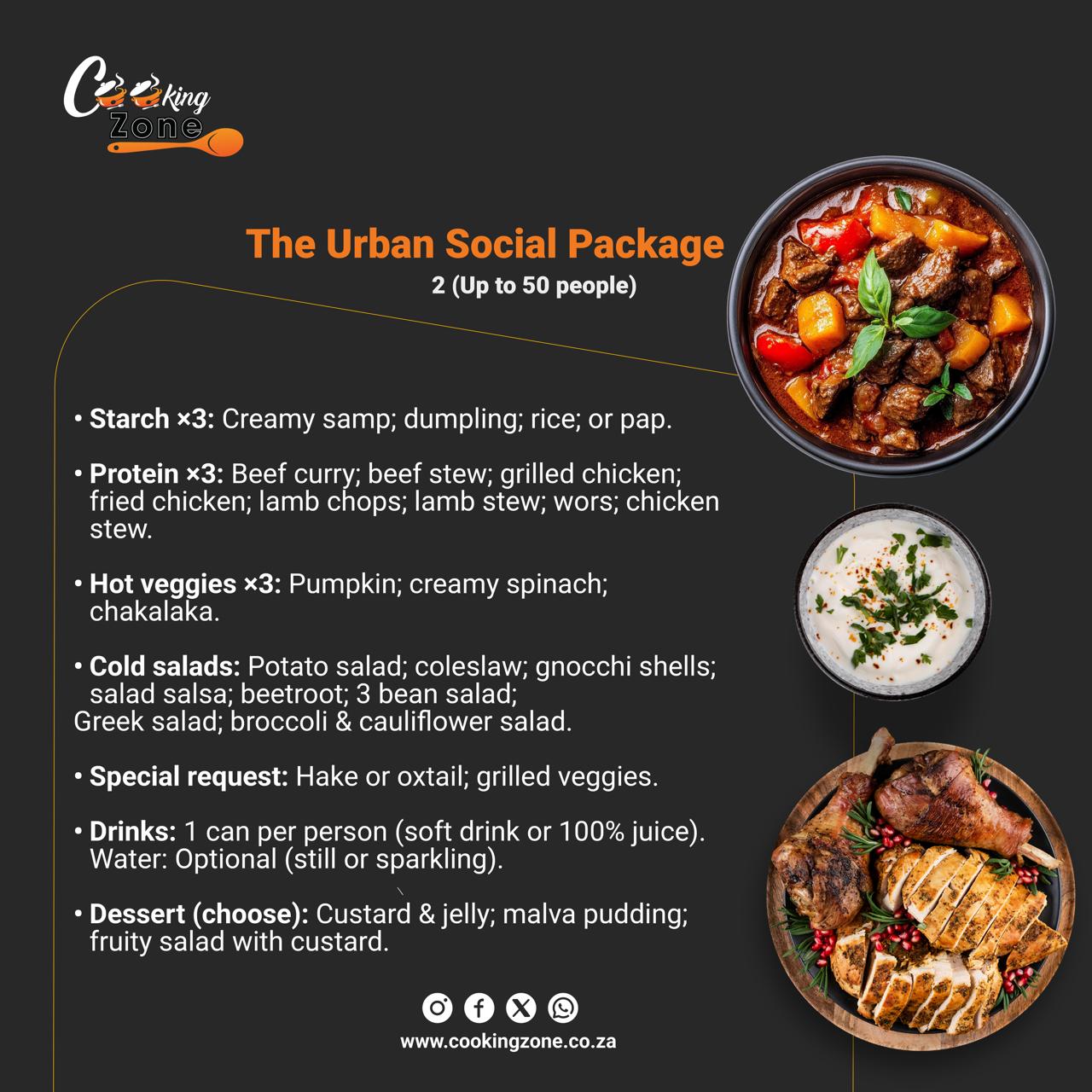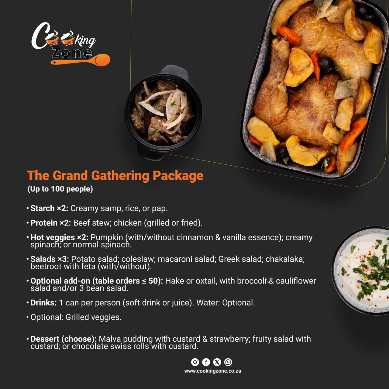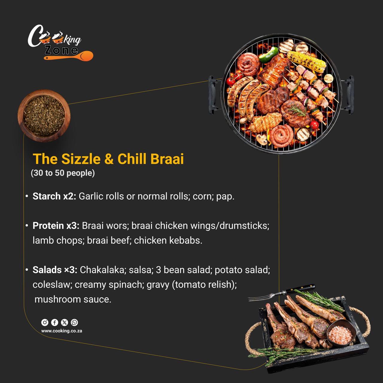 Ideal for 30 to 50 guests with braai favorites, 2 starch options, and 3 fresh salad selections.